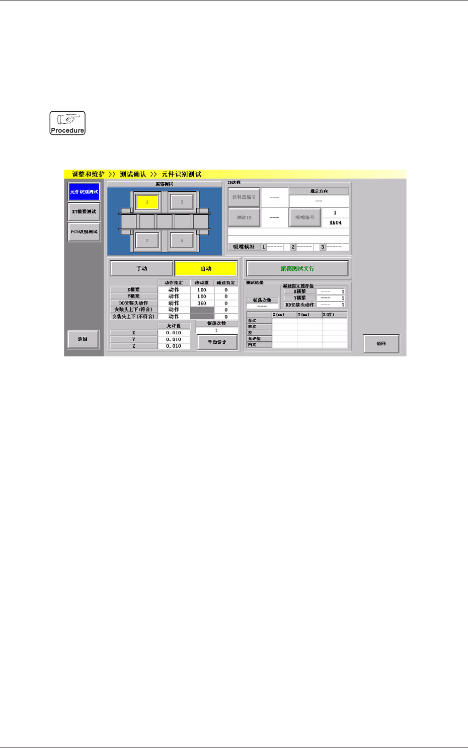 4-63 0708-001 5.1 元件识别测试 (7) 按 [ 振荡测试实行 ] 按钮后,在 10 秒钟内再按操作台的 [START] 按钮,便执行振荡测试、显示测试结果。 (8) 按 [ 返回 ] 按钮,便返回到 “ 元件识别测试 ” 界面。 • 振荡自动测试时的执行步骤 (1) 按测试模式的 [ 自动 ] 按钮。 在 “ 振荡测试 ” 界面的测试结果栏中追加显示 “ 减速指定推 荐值 ” 。 Fig.2D32 “ 振荡测试 ” 界…