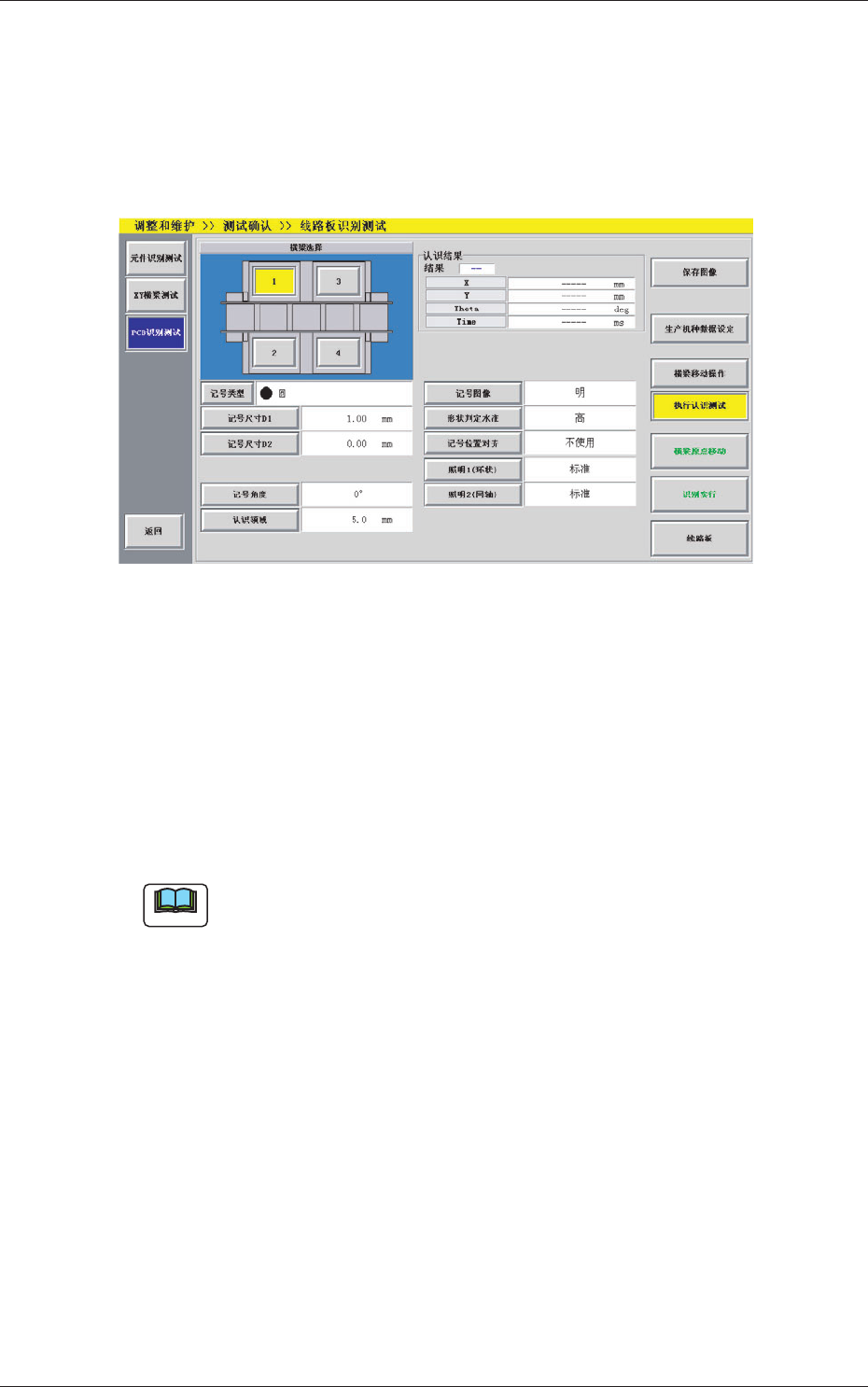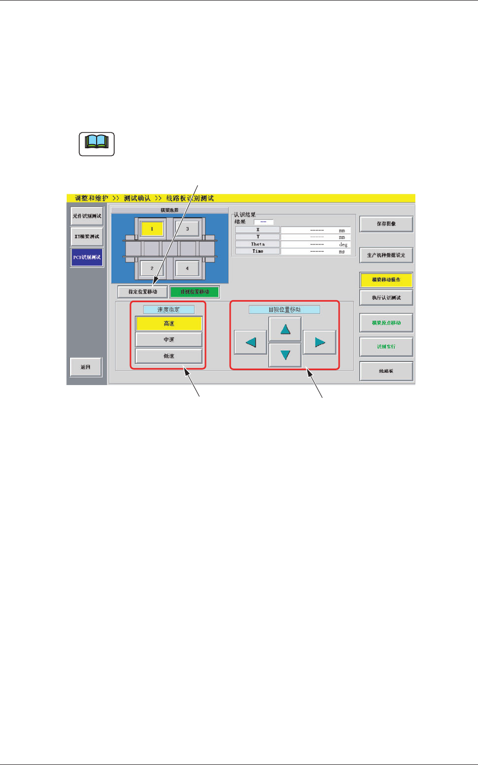 4-73 0708-001 5.3 线路板识别测试 5.3.2 目视位置移动 根据目视对齐指定线路板识别位置。 在 “ 线路板识别测试 ” 界面中,按 [ 横梁移动操作 ] 按钮后再按 [ 目视 位置移动 ] 按钮,便显示 “ 目视位置移动 ” 界面。 Note 作为 “ 线路板识别测试 ” 界面的初始界面,在 [ 横梁移动操作 ] 按钮 被按下的状态下显示。 [2] [3] [1] Fig.2D34-3 “ 目视位置移动 ” 界面 […