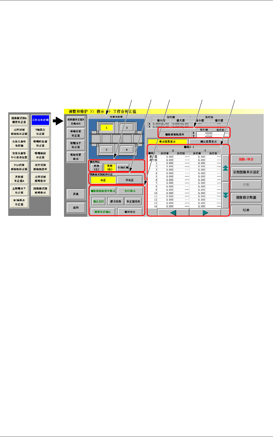 4-120 0708-001 6.5 其他教示 [4] 操作按钮 [ 栅格照相机倍率教示 ] 按钮 进行栅格照相机倍率教示。 [ 实行教示 ] 按钮 用选定安装头进行教示。 [ 确认实行 ] 按钮 使用教示结果,再次确认棋盘状标记。 [ 磨合无效 ] 按钮 设定磨合无效时,按该按钮。 按钮的背景色变为黄色。 [ 补正值无效 ] 按钮 将补正值设为无效时,按该按钮。 按钮的背景色变为黄色。 [ 横梁传送确认 ] 按钮 确认横梁传送。 [ …