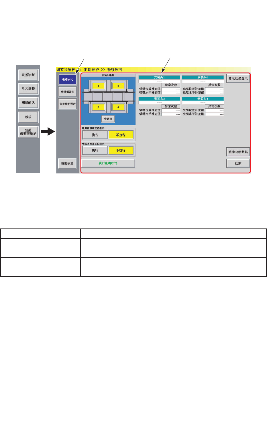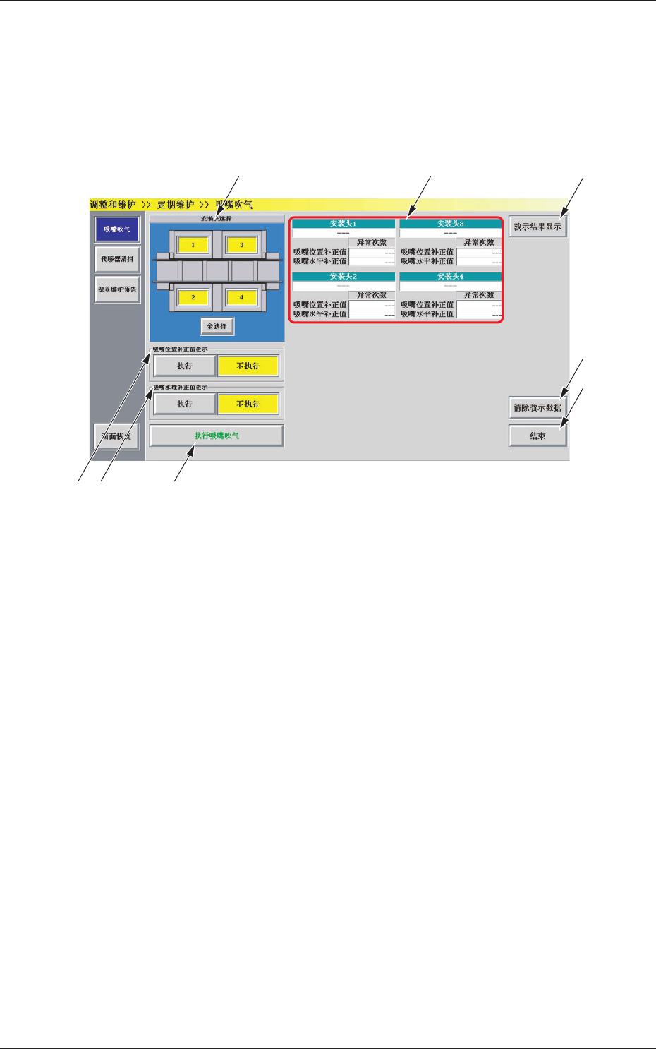 4-147 0708-001 7.1 “ 吸嘴吹气 ” 界面 7.1 “ 吸嘴吹气 ” 界面 通过吹气动作,进行吸嘴轴堵塞的去除及吸嘴自身的堵塞去除。 在 “ 定期维护 ” 子菜单栏中, 按 [ 吸嘴吹气 ] 按钮, 便显示 “ 吸嘴吹气 ” 界面。 [4] [2] [3] [1] [5] [6] [7] [8] Fig.2D72 “ 吸嘴吹气 ” 界面 [1] 安装头选择按钮 用装置图像显示表示安装头的按钮。 选择进行吸嘴吹气的安装头…