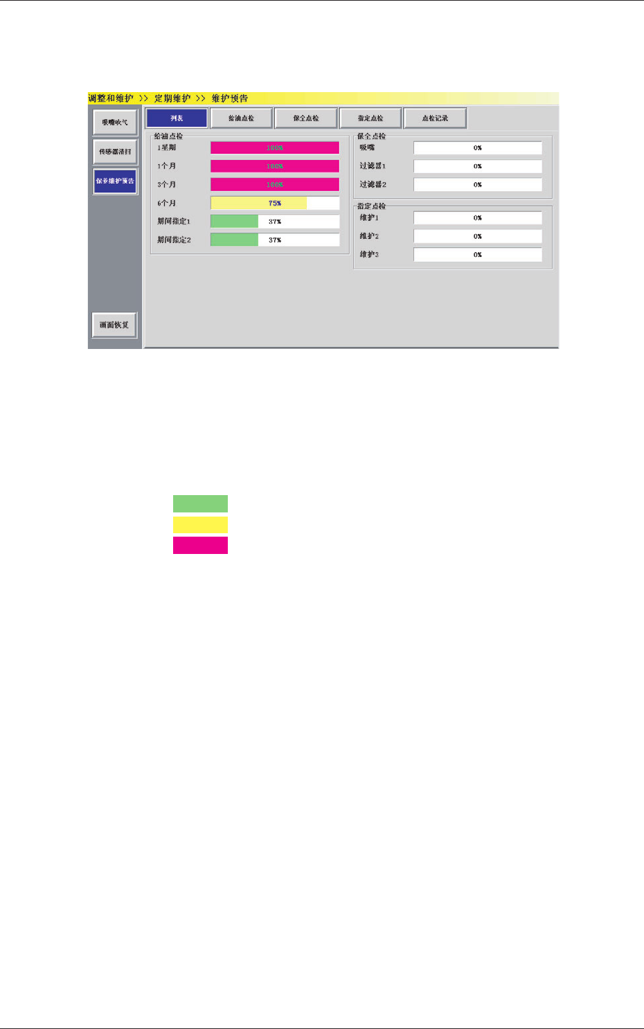 用百分比 (%) 显示给油点检、保全点检、指定点检各项目的当前状况。