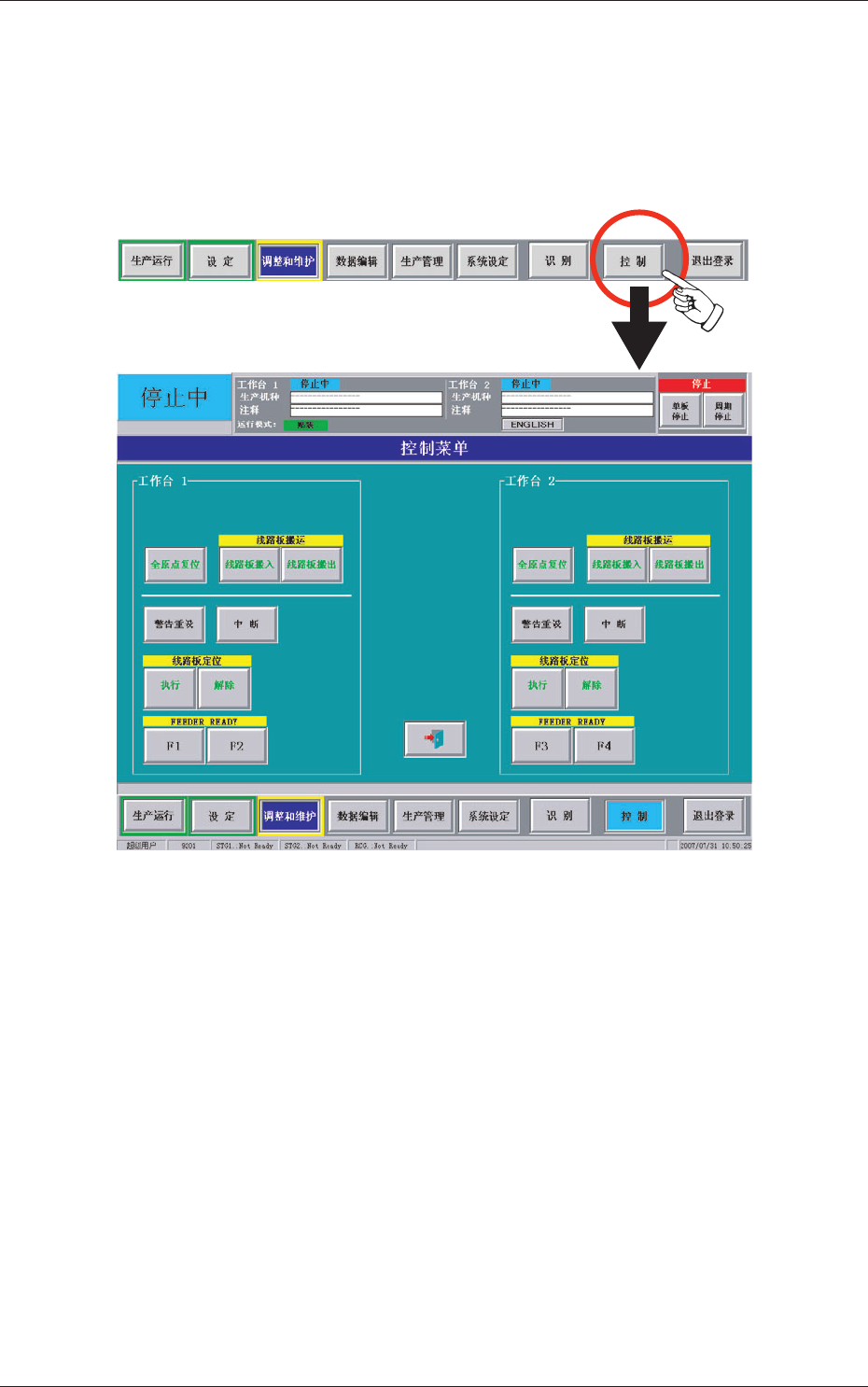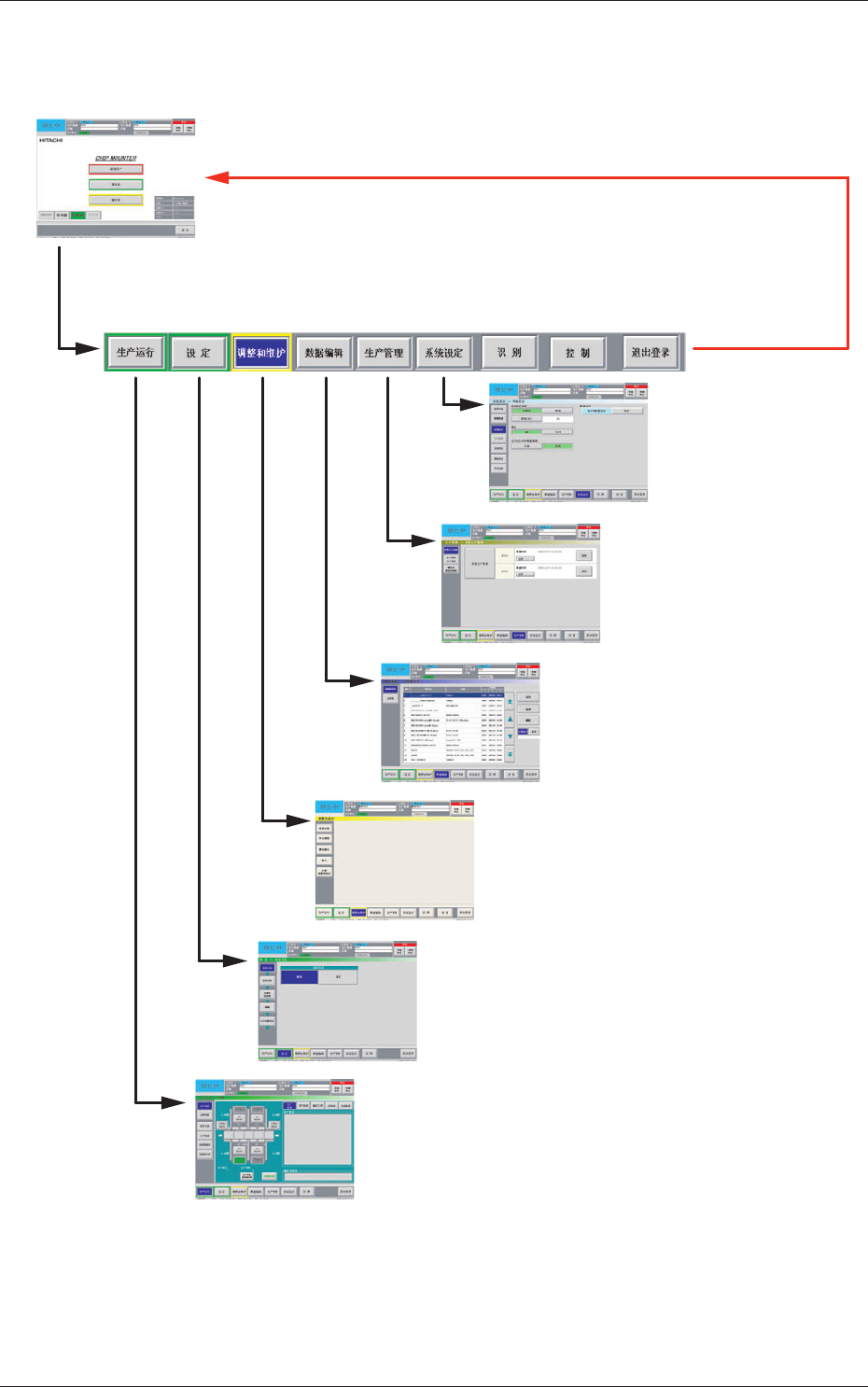 1-8 0708-001 2.2 操作界面的切换 “登录类型选择”界面 主菜单栏 [退出登录] [退出登录] “系统设定”菜单界面 第三卷 第六章 “生产管理”菜单界面 第三卷 第五章 “数据编辑”菜单界面 第三卷 “调整和维护”菜单界面 第二卷 第四章 “设定”菜单界面 第二卷 第三章 “生产运行”菜单界面 第一卷 第二章 Fig.2A7 操作界面的切换 2.2 操作界面的切换