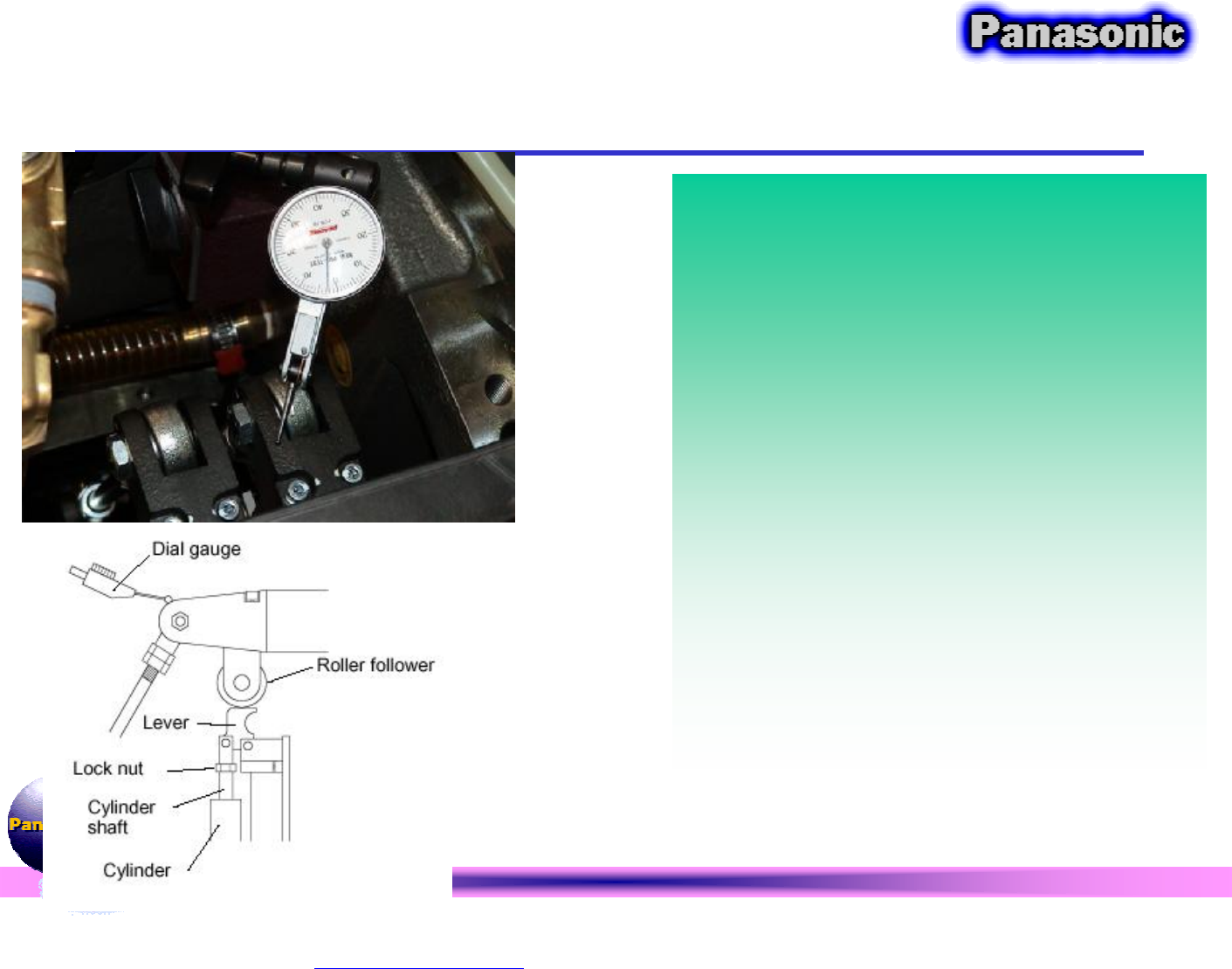 八 . 调整 F EE D UN I T STO PP ER 间隙 1 . P OW E R ON , ORG 。 2. 副 操 作 盘 “ L OW LO CK ” T UR N ON 3 . C T1 25 度 , 4. 打 百 分 表 于 LO W F E ED CA M L E VER 上 5. “ F E E D L OCK ” T U RN ON, 观 察百 分 表 变化 标 准 :0 . 05 — 0 . 1MM 6 . …