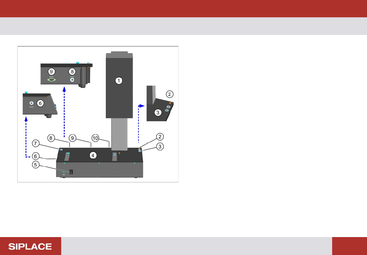 Introduction – Overview of Devices 11 – O v e r v ie w o f D e v ic e s S-Feeder Checking Device 1. Camera tower 2. Connection for device ground 3. Connection for ESD wristband 4. Contac t surfa ce for feeder 5. ON / OFF…