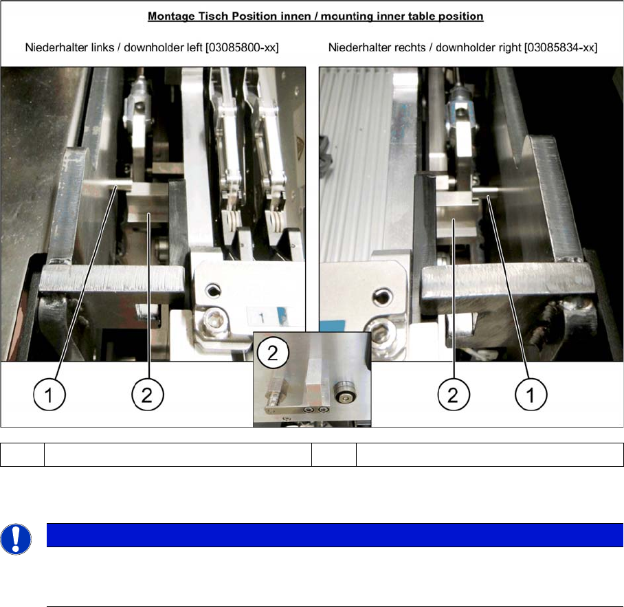► After pulling the table in through the cylinder, the downholder pin (1) should be up, against the com-