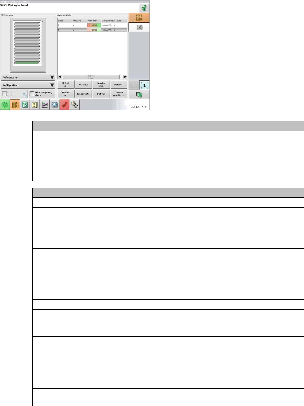 Occupancy check Starts the machine function for checking the tray carriers. The position
