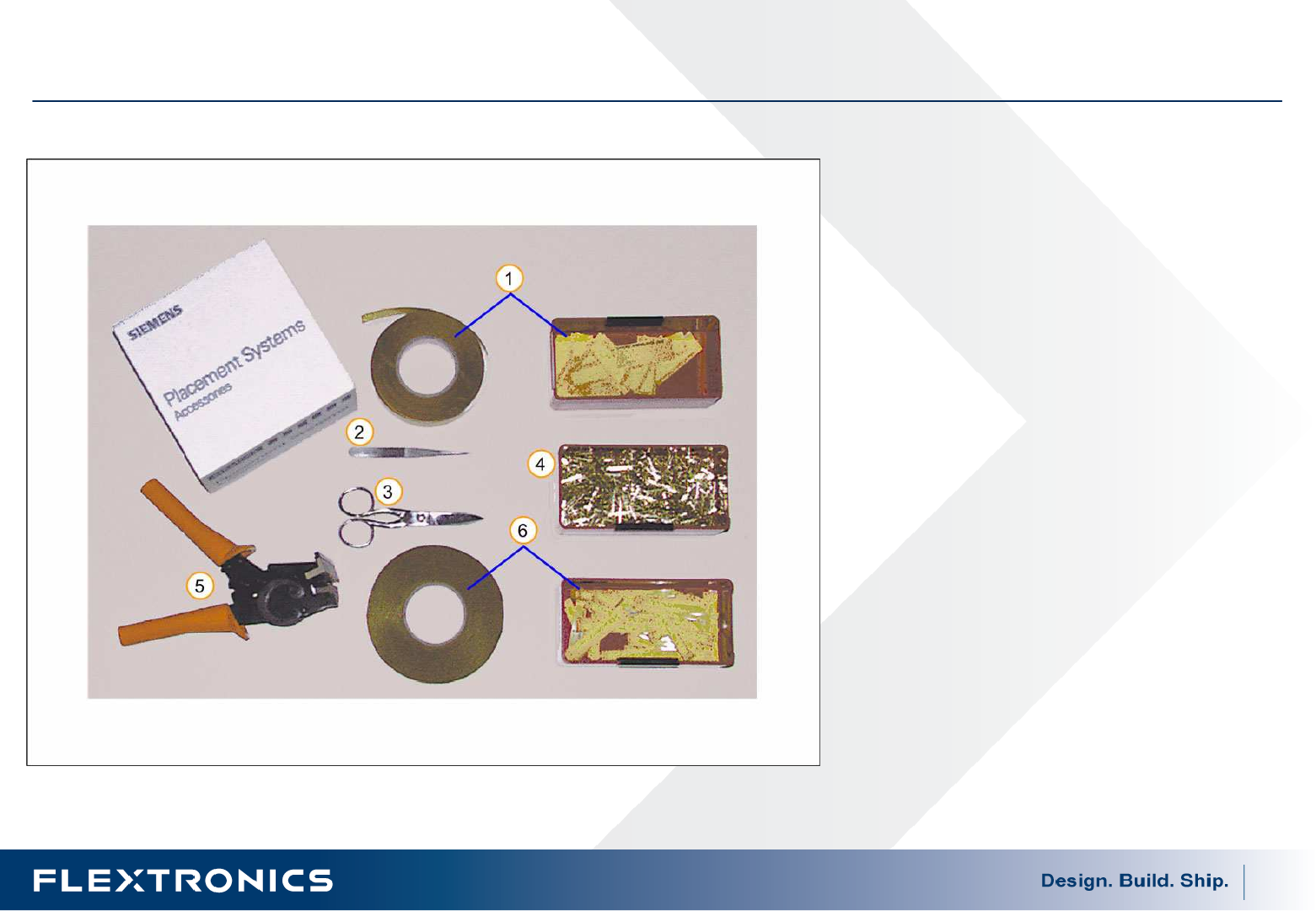 22 Siplace 操作 介绍 操作 介绍 操作 介绍 操作 介绍 — 续料 要求 的工 具和 材料 续料 要求 的工 具和 材料 续料 要求 的工 具和 材料 续料 要求 的工 具和 材料 当使用 接 料方 式 进行续料时,要 求 以下的这些工 具 。 1. 接 料带 — 小胶纸 2. 镊 子 3. 剪 刀 4. 接 料 铜扣 5. 接 料 钳 6. 接 料带 — 大胶纸