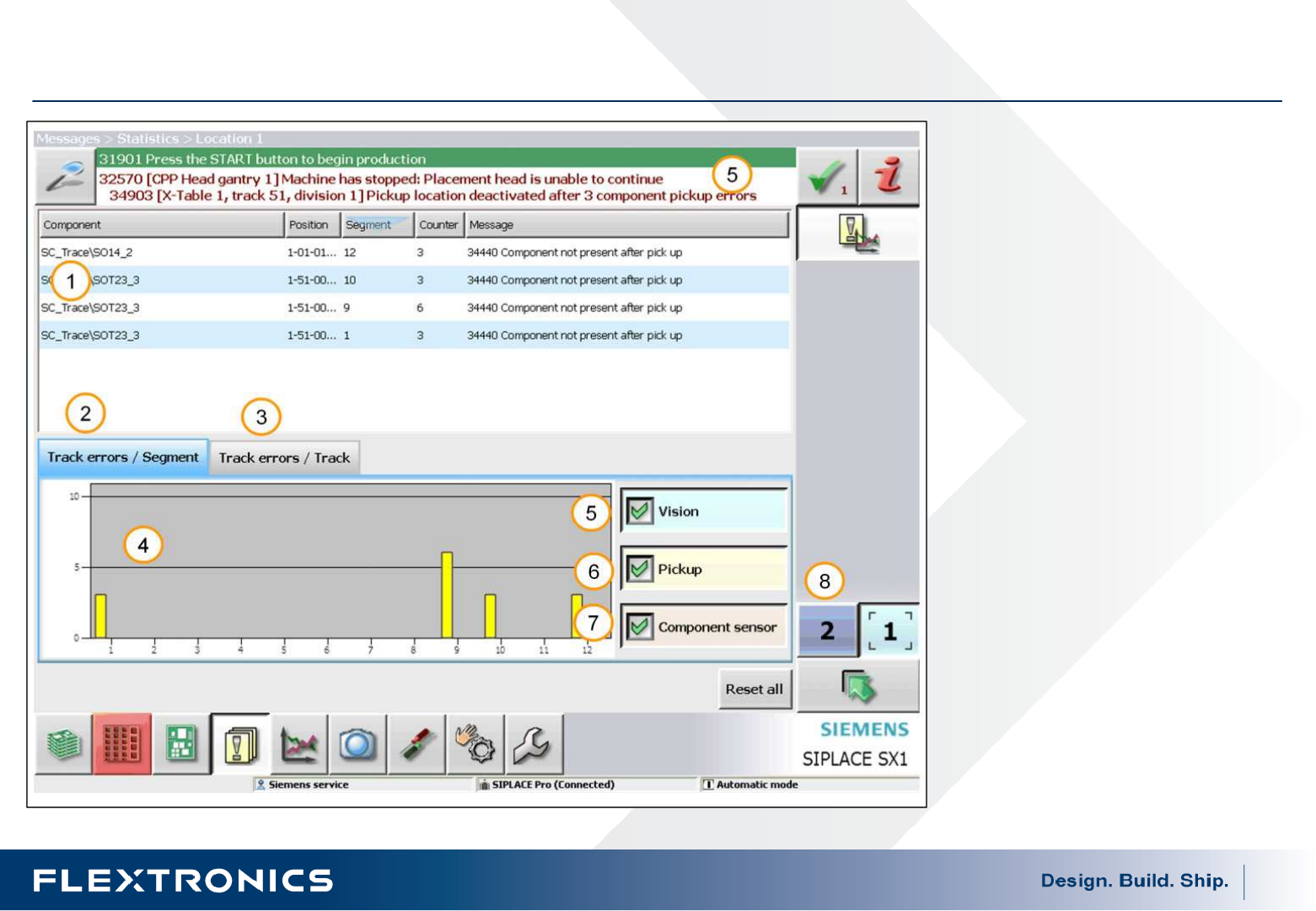 47 Siplace 操作 介绍 操作 介绍 操作 介绍 操作 介绍 — 错误 统计 错误 统计 错误 统计 错误 统计 — 一区 一区 一区 一区 1. 列出一区所有相关 错 误信息 2. 显示发 生 错误 的段位 器 号码 3. 按 照 FEEDER 栈 位 显 示错误信息 4. 错误信息 的 图形显示 5. 影响错误 6. 取 料 错误 7. 元件感应器 错误 8. 错误信息显示 区域的 切 换 — 点 击此处可以 切 换 到二区