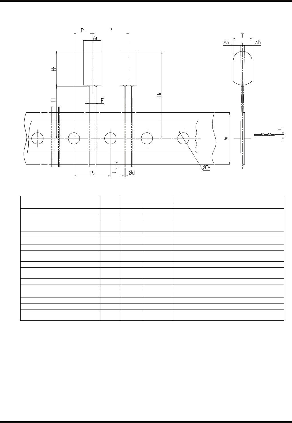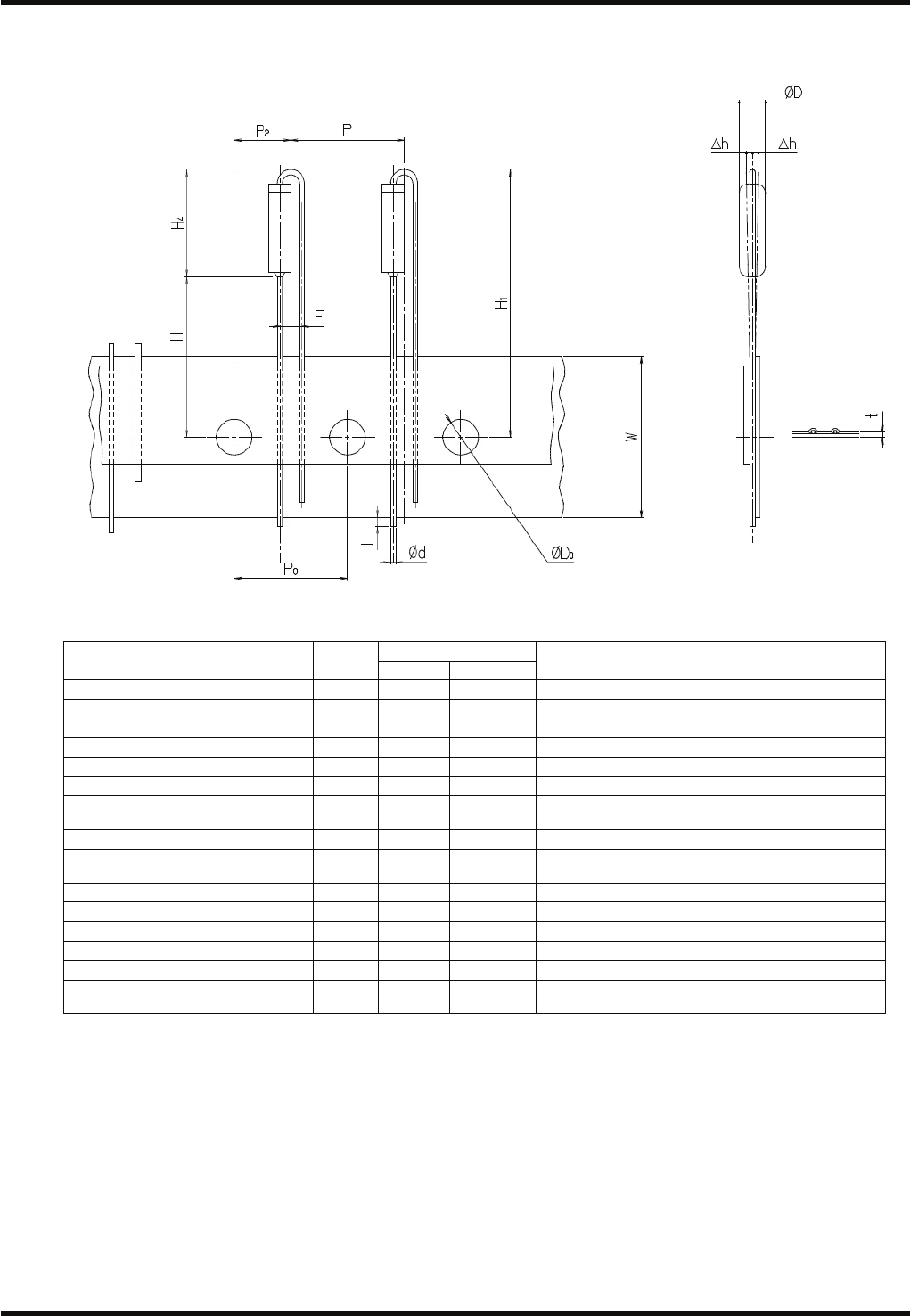 RL132 参考手册 2.5 适用元件 DA9RCC-12-160-B0 2.5-23 20. 二极管 尺寸 (mm) 内容 记号 数值 容许范围 备注 元件直径 Ø D 3.0 最大 引脚线直径 Ø d 0.6 +0.06 -0.05 软铜线是 Ø 0.6 mm 硬铜线和 CP 线是 Ø 0.5±0.05 mm 元件间距 P 12.7 ±1.0 孔间距 P 0 12.7 ±0.3 累积间距误差 = 1.0mm /20 间距 从孔中心到…