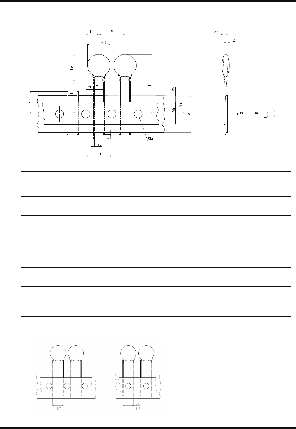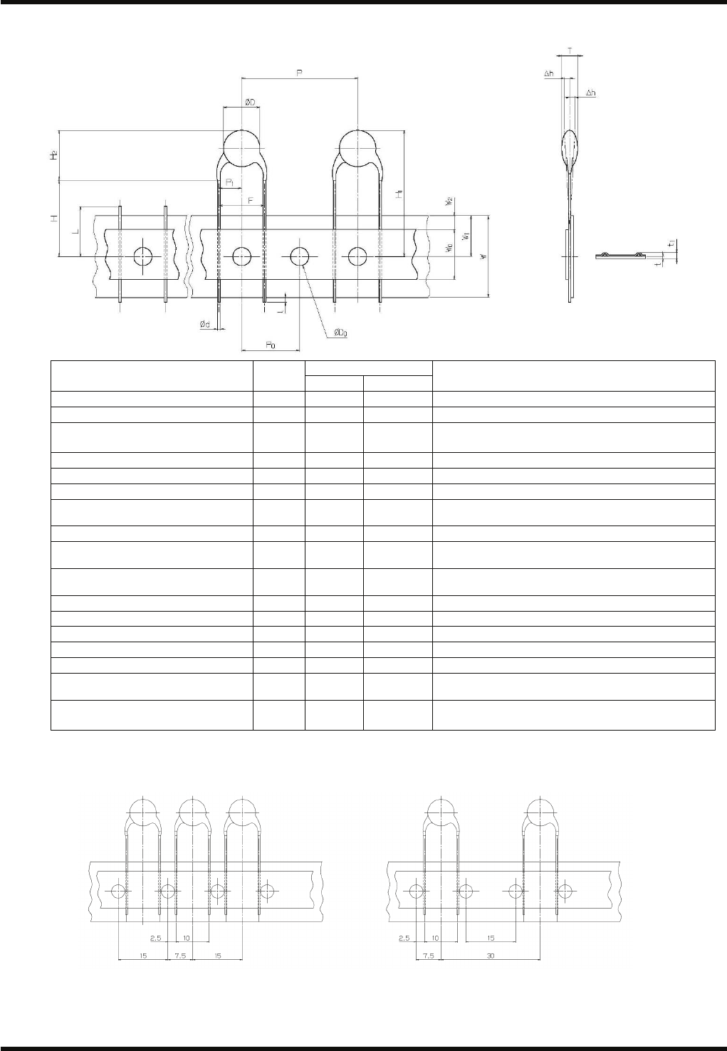 RL132 参考手册 2.5 适用元件 DA9RCC-12-160-B0 2.5-26 23. 长间距陶瓷电容器 ( 成型引脚 B) 尺寸 (mm) 内容 记号 数值 容许范围 备注 元件直径 Ø D 13.0 最大 元件厚度 T 4.0 最大 引脚线直径 Ø d 0.8 最大 软铜线是 Ø 0.8 mm ( 硬度在 H B 50 以内 ) 硬铜线是 Ø 0.6 mm ( 硬度在 H B 80 以内 ) 元件间距 P 15.0 ±1.0…