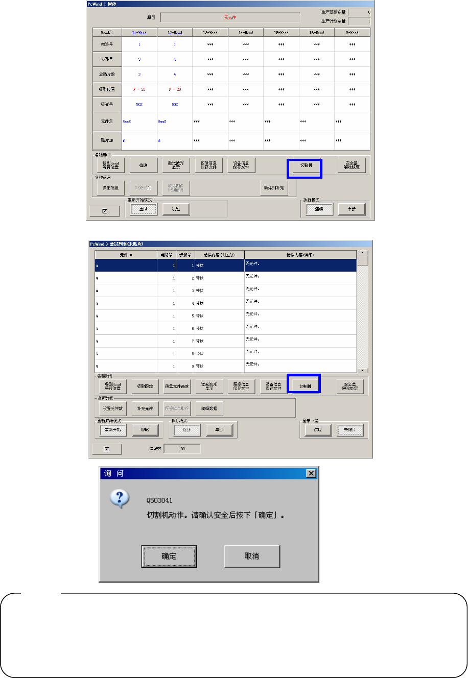 按下[切割机]按钮后,将显示警告信息,此时若按下[确定]即进行切割动作。