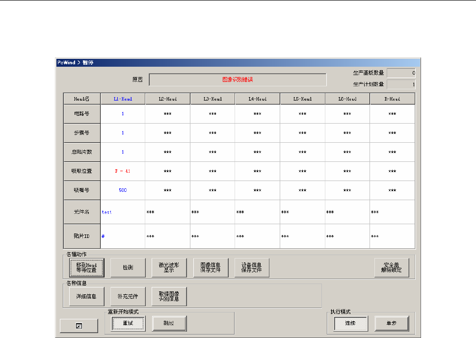 如果在操作选项中设置了“发生错误时暂停”,从如下暂停画面可以进行重新显示/保存发生图像识别错