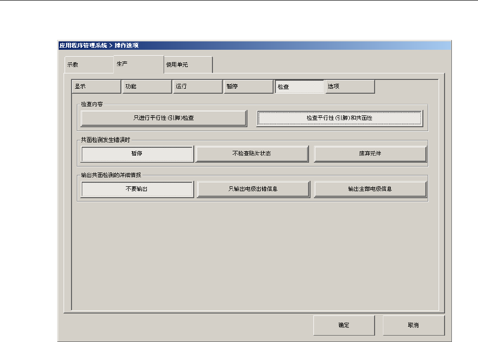 第2部 功能 详解编 第1 3章 选项 组件 13-149 13-20-5 操作选项 从菜单栏中,选择 “ 生产 ”/“ 操作选项 ” ,选择 “ 生产 - 检查 ” 选项卡。 请设定各项目。 详情请参见 “7-3-6 生产时的操作选项设置 ” 。