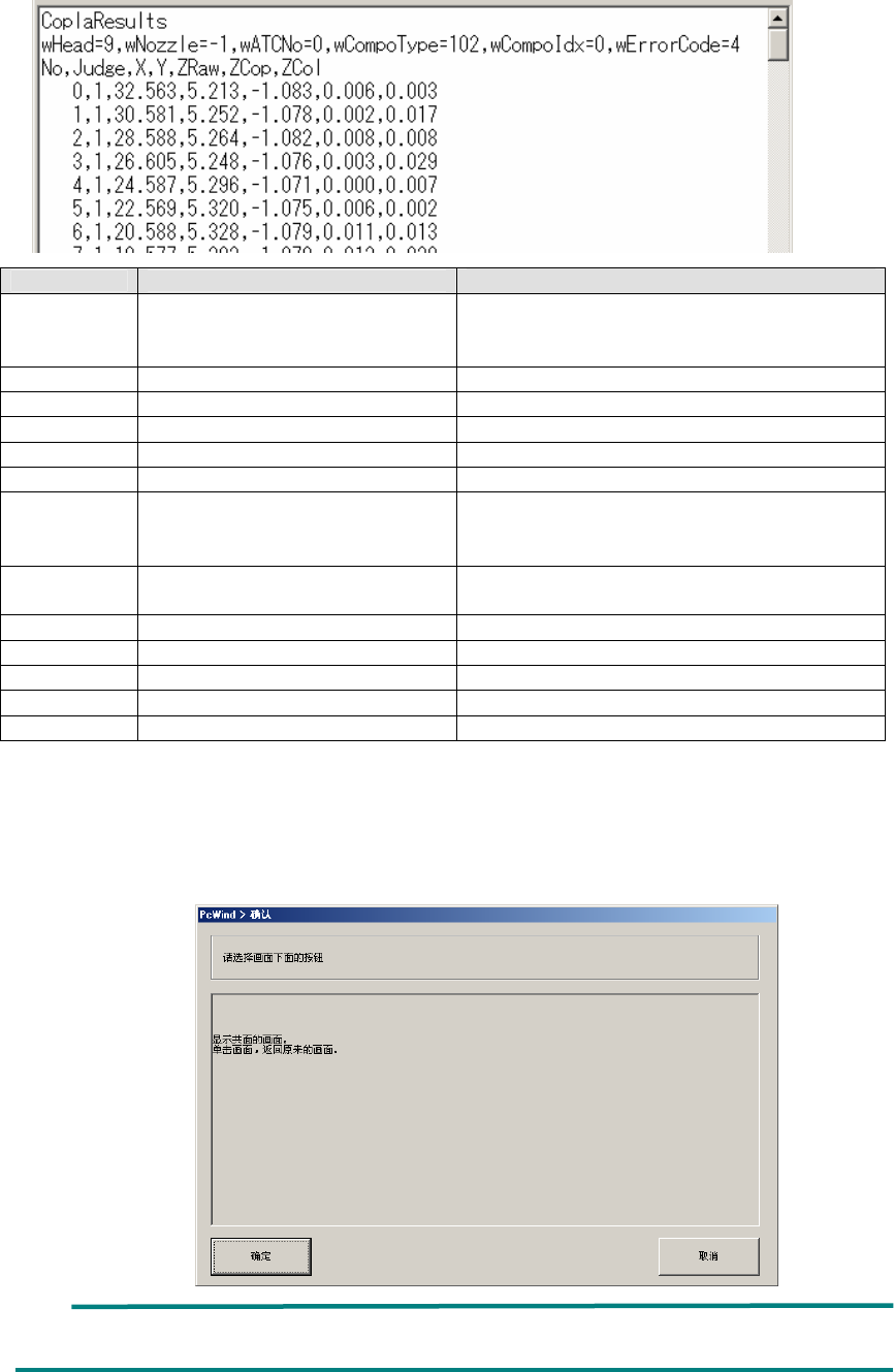 第2部 功能 详解编 第1 3章 选项 组件 13-155 输出详细信息, 会输出各电极的检查结果、 共面传感坐标的 X 坐标、 Y 坐标、 从焦点高度得到的 Z 坐标、共面计算结果、共线计算结果。 备注 wHead 检查 He ad 3 : L1 Hea d 4 : L2 H ead 5 : L3 Head 6 : L4 Hea d 7 : L5 H ead 8 : L6 Head 9 : R Head wNozzlw 吸嘴编号 wA…