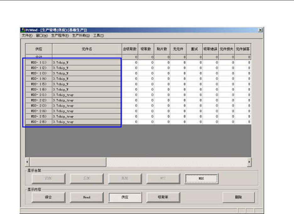 MDS 元件显示了各类元件所使用贴片头的信息。吸取位置栏的 MDS-后()中的数字表示吸取元