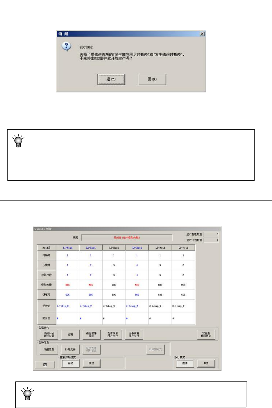 在设置了操作供选项的『发生部件用尽时暂停』或者『发生错误时暂停』时,在开始生产时显示