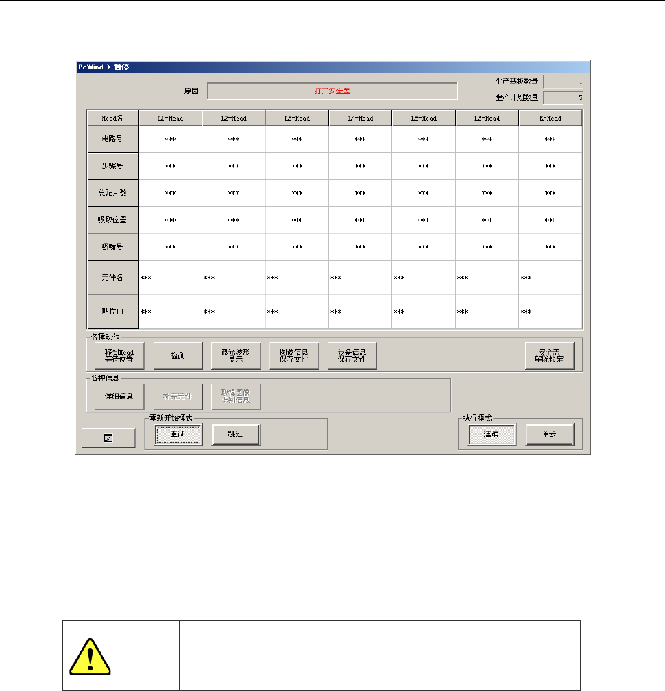 生产中供料器台架下降时,则会暂停生产,显示暂停画面。