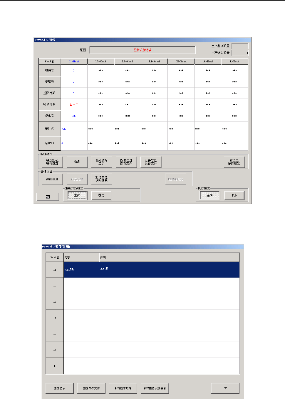 第 1 部 基本編 第 2 章 生产 2-203 2-15-14 图像识别异常 2-15-14-1 发生图像识别异常 如果在操作选项 – 生产 – 暂停选项中, 勾选了发生图像识别错误时暂停, 则在生产中发生图像识别异 常后,会停止生产,显示暂停画面。 在上述画面中,按下详细信息按钮,即可打开错误详细信息画面。 图像识别异常时,会像 下图一样在详细信息对话框里显 示[图像显示]、 [ 图像保存文件 ] 、[取得图像 数据]、[取得图像识…