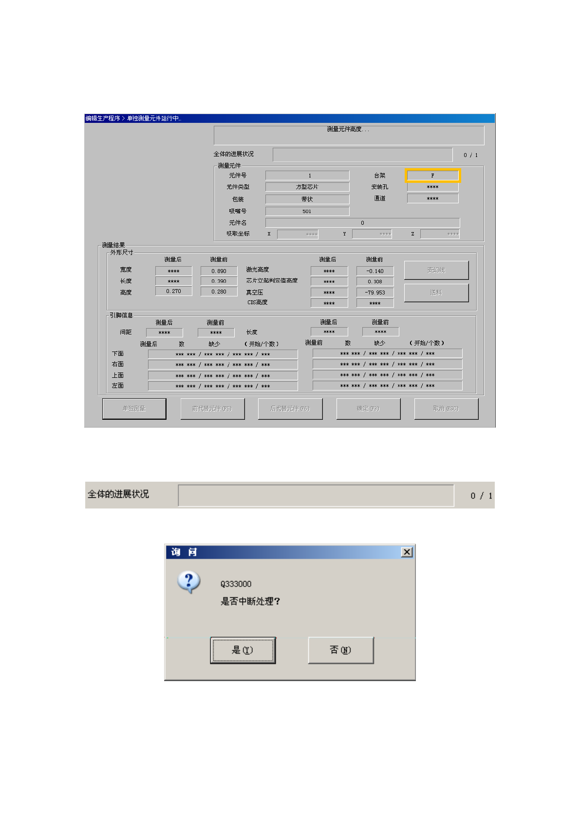 在单独测量过程中,显示如下画面。显示正在进行单独测量的元件的内容及吸取位置,并依次显