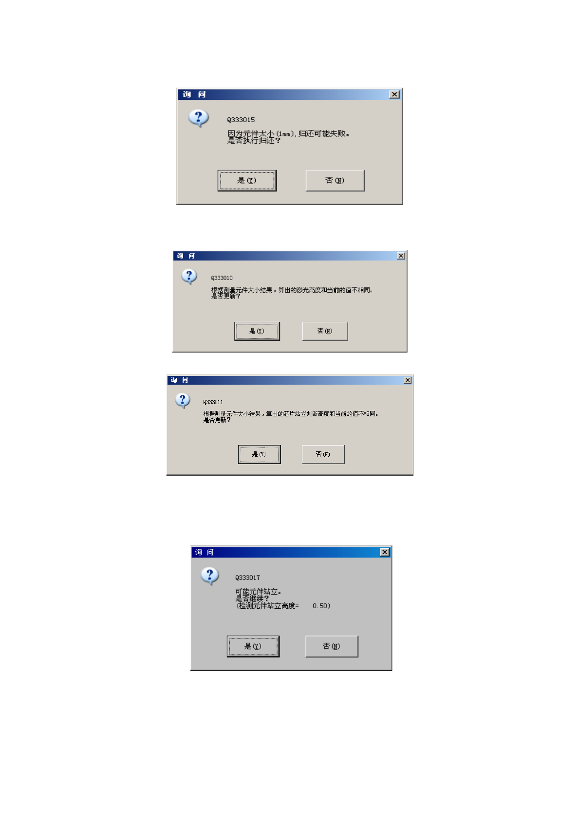 根据尺寸计算出的激光高度或芯片站立判定高度与原来的值不同时,显示如下询问。