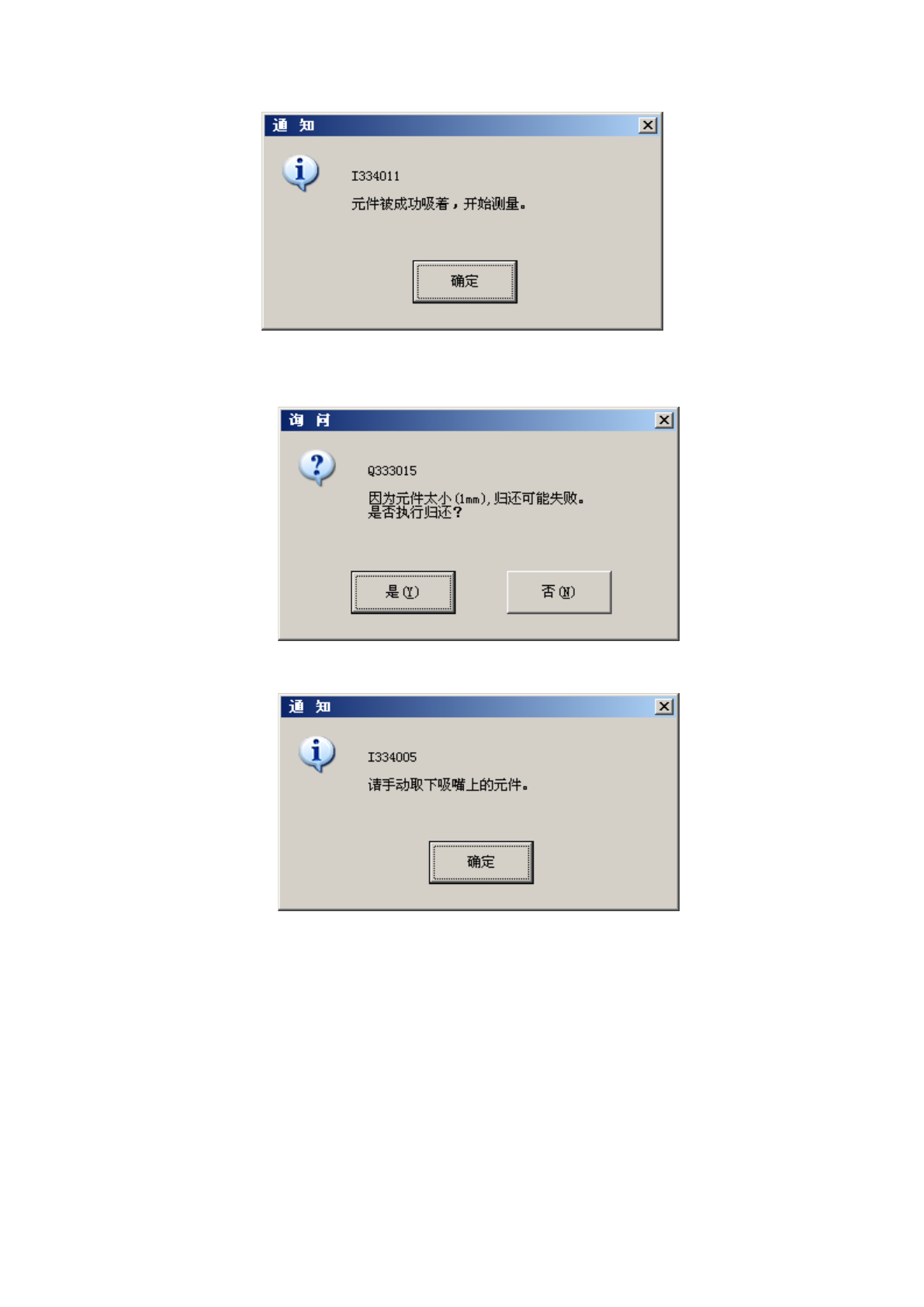 第 1 部 基本编 第 4 章 制作生产程序 手动吸取成功时 ,显示以下提示 信息。 归还元件时, 根据元件的包装有 不同的处理, 如果元件尺寸 为 1mm 以下时, 会询问是选择归还测 量 后的元件,还是 废弃的提示信息 。 手动归还时,会 显示以下提示信 息,此时请手 动从吸嘴取下元 件。 4- 283