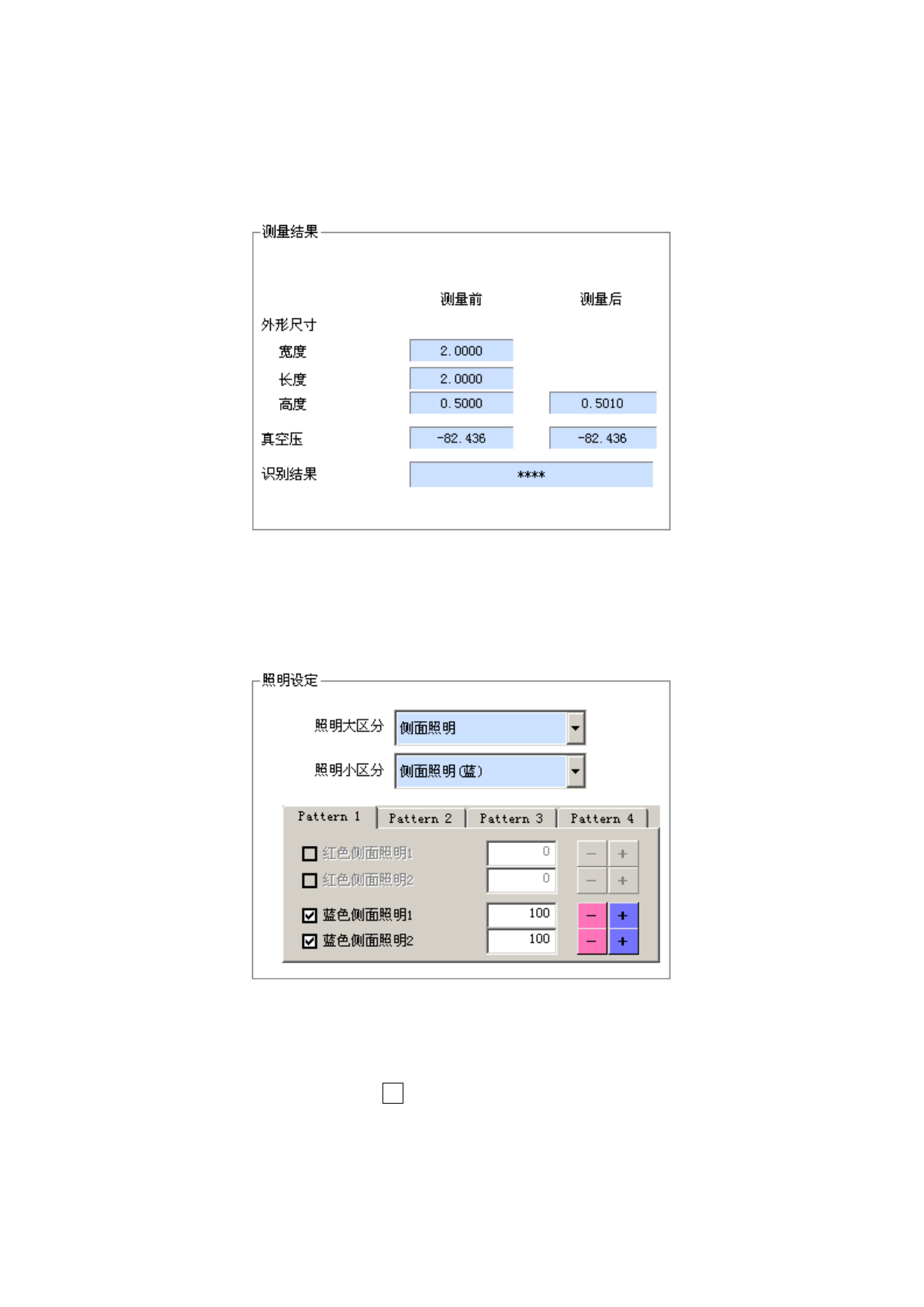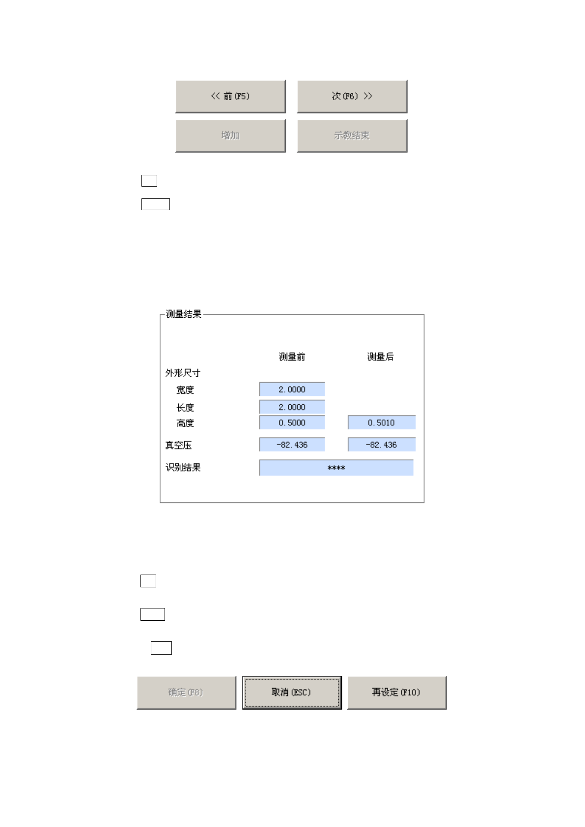 显示测量前及测量后的外形尺寸(横、纵、高度)、真空压、识别结果。