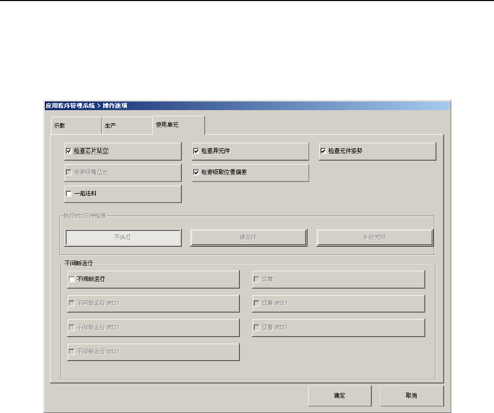 第2部 功能 详解编 第7章 操作选项 7-22 内容 序号 项目 状态 动作及详细内容 设置执行 “ 芯片站立 ” 检查。 对元件数据的 “ 芯片站立 ” 有效的元件, 进 行芯片站立检查。 1 检查芯片站立 尽管元件数据有设置,但不进行 “ 芯片站 立 ” 检查。 设置执行检查异类元件功能。 对元件数据的 “ 检查异元件 ” 有效的元 件, 进行异元件检查。 2 检查异元件 尽管元件数据有设置, 但不进行 “ 异元件 ” 检查。 设…