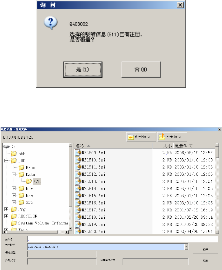 第2部 功能 详解编 第8章 机器设置 8-1 1 如选择的吸嘴信息已被注册时,会显示如下画面。 选择 “ 是 ” 后,该吸嘴的数据被覆盖更新。 如果 USB 存储器未插入 USB 端口,或因使用 USB 存储器故障等原因不能读出时,会显示默认的追 加吸嘴数据文件夹浏览画面。 在此处保存有已存储的追加吸嘴数据文件。