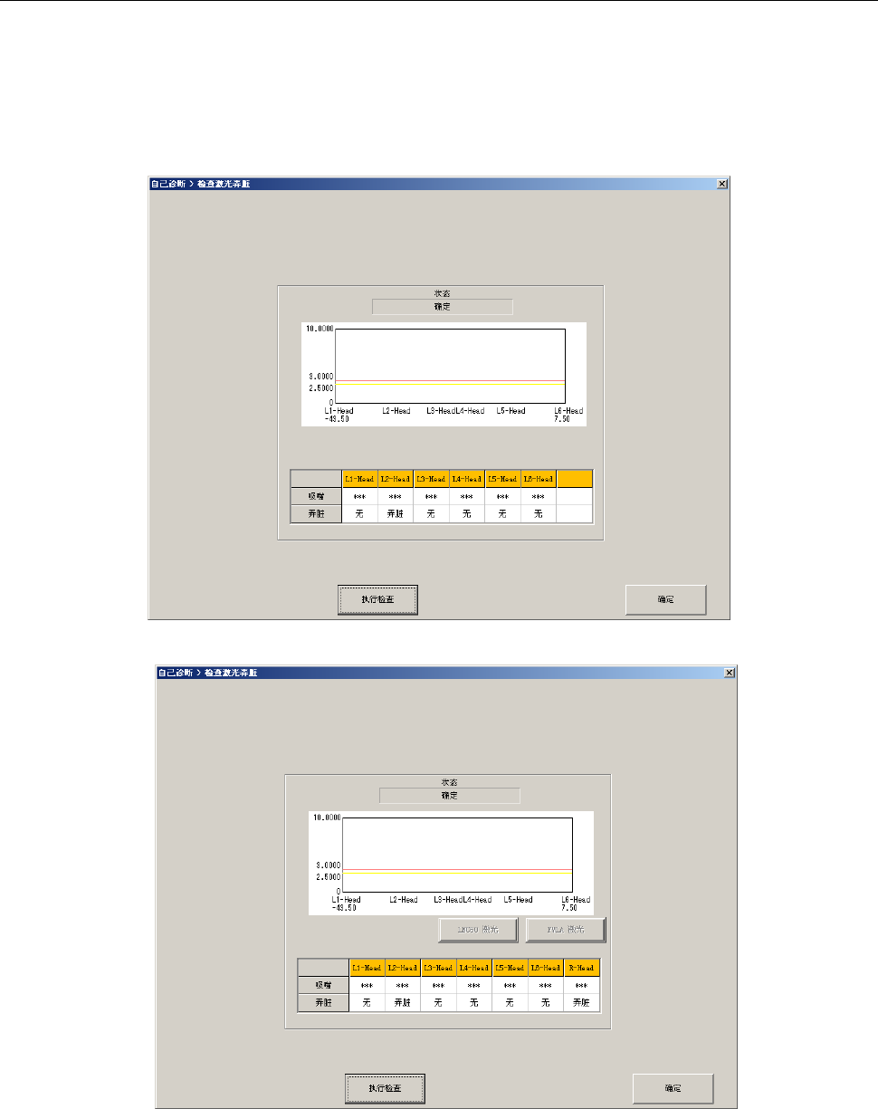 第2部 功能详解编 第12章 机器自动诊断功能 12-8 12-3-3 激光弄脏检查 从下拉菜单选择 [ 个别诊 断 ]-[ 激光弄脏检查 ] ,或 用命令按钮选择 [ 激光弄 脏检查 ] ,即显示激光弄 脏检查画面。 指定 Head ,按 [ 执行检查 ] ,则执行激光弄脏检查。 结果会显示在 [ 判定 ] 栏里。 · 检查激光弄脏画面 (KE-3010/3020V) · 检查激光弄脏画面 (KE-3020VR)