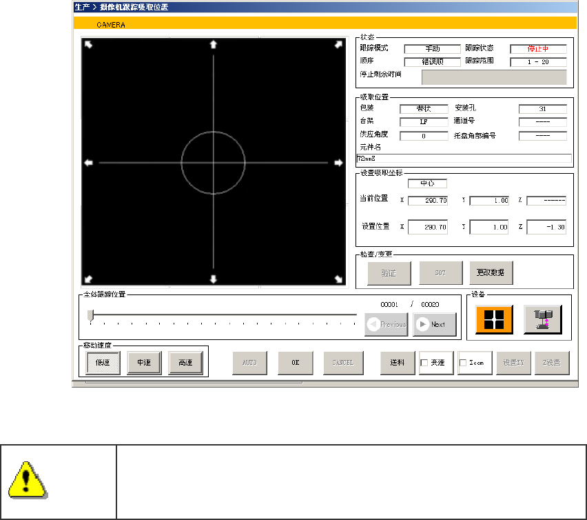 第 1 部 基本編 第 2 章 生产 2-41 ② 请按下[吸取 跟踪]按钮。 显示以下的摄像机跟踪吸取位置画面。 * 吸取位置跟踪的详情内容请参照 “2-14-6 摄像机跟踪吸取位置 ” 。 注意 在打开吸取跟踪自动传送画面之前,轴会移动 。在执行前,请务必确认 设备内部没有人在进行作业。另外,为了防止 人身伤害,在机器运行过 程中切勿把手伸入设备内部,脸和头也不要靠近设备。