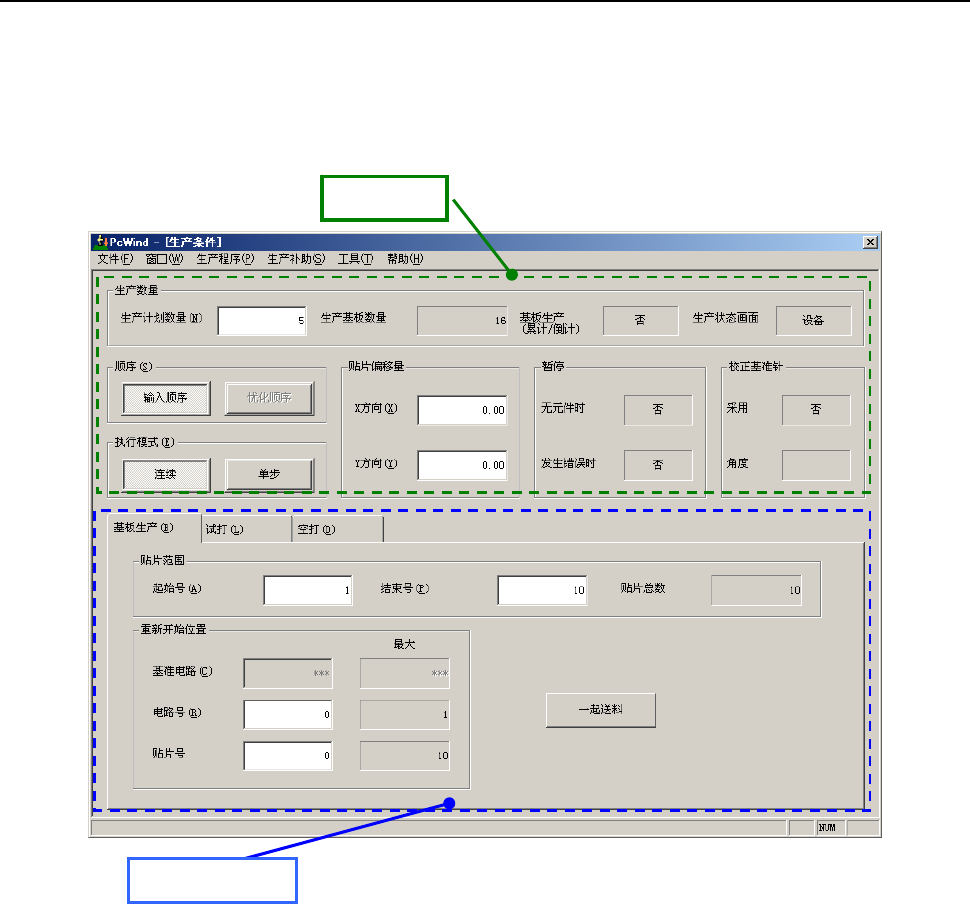 在主画面上选择“生产”/“基板生产”,或功能栏的“基板生产”,则会显示如下的生产条件设置画面。