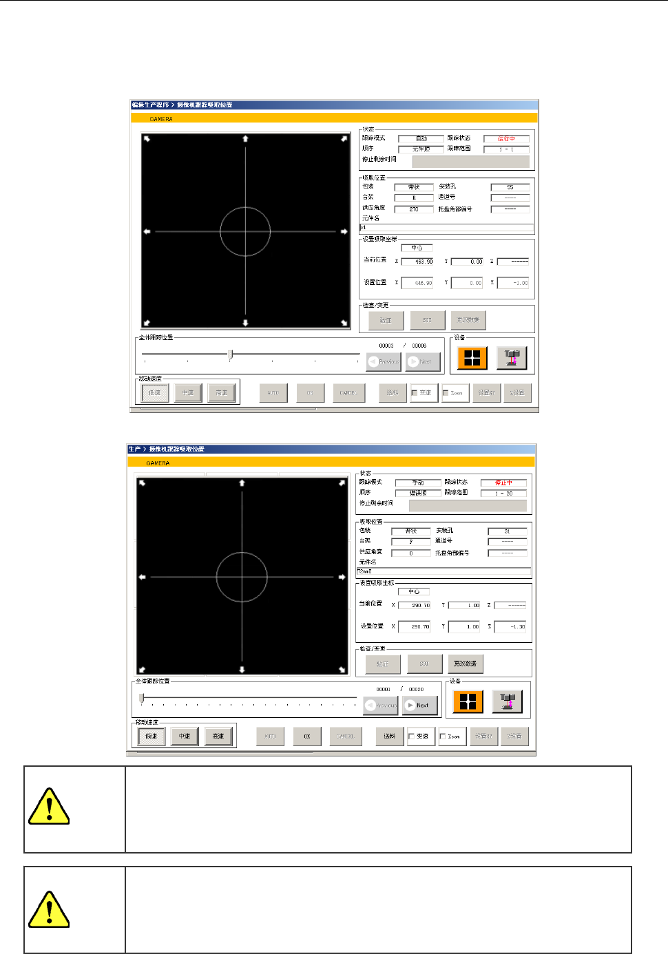 在打开吸取跟踪画面以前,为进行台架标记识别,轴将会移动。