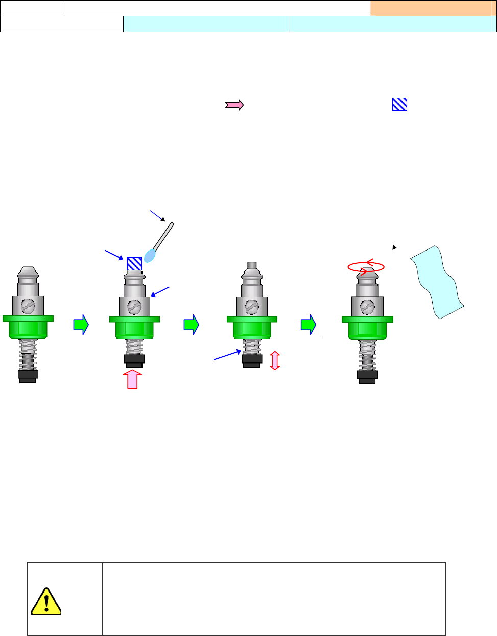 第 1 部 基本編 第 3 章 维护 3-21 吸嘴用超声波清洗后放置下来,会使吸嘴内圈生锈。 请按下列顺序,在吸嘴滑动部上油。 1) 清洗后,用气枪等把吸嘴内部的酒精吹干净。 2) 在图示的润滑油涂抹部分(把吸嘴滑动部向 方向推入时从吸嘴内圈蹦出的 部分), 用半湿的棉棒涂上一滴油。 3) 把吸嘴滑动部分上下滑动 20 ~ 30 次,使润滑油涂布均匀。 4) 用干净抹布,把吸嘴周围多余的油擦干净。 5) 涂油后,把吸嘴放回 ATC 单…