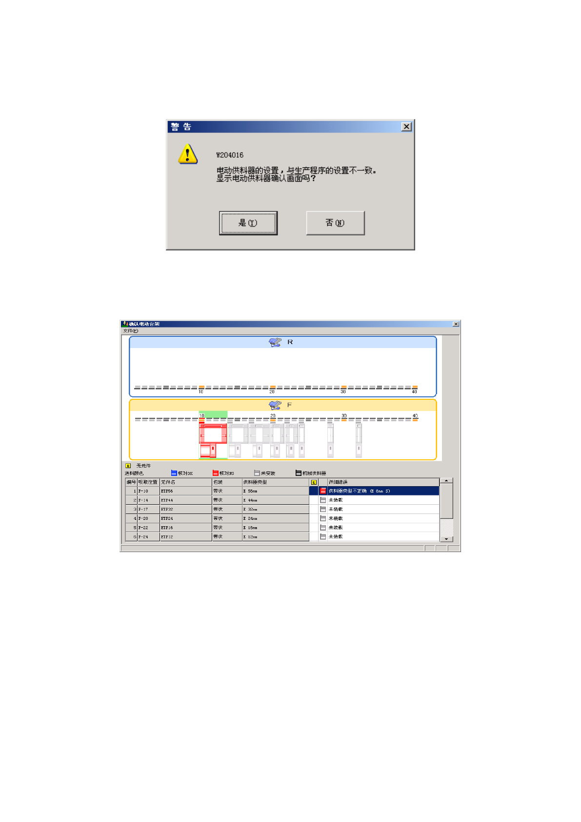在电动供料器一致性检查中,检查出错误时,会显示以下提示信息。