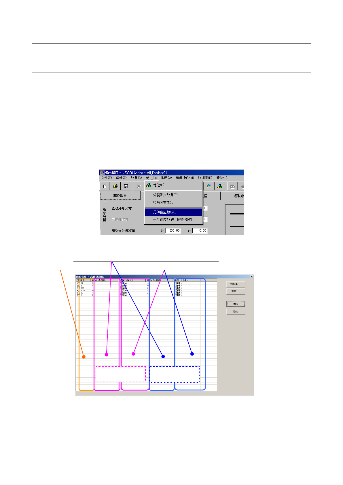 优化是指对用编辑程序制作的生产程序进行“供料器分布的优化”,“吸取贴片顺序的优化”。