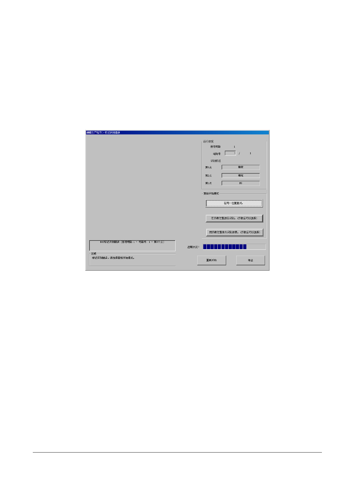 在执行中 BOC 标记识别失败时,会在画面的“说明”栏中显示提示信息,可以选择“重新开始模式”项目。