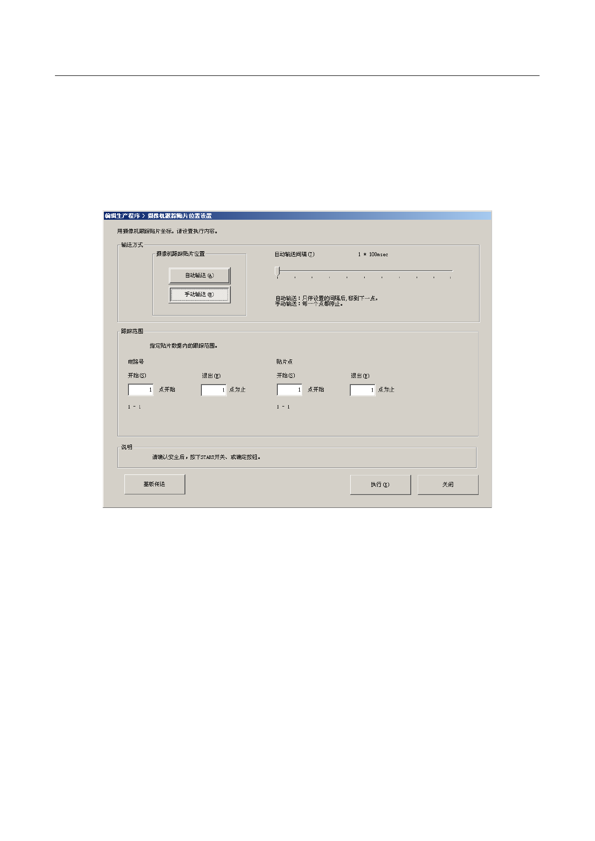 第 1 部 基本编 第 4 章 制作生产程序 4-5-4-7 跟踪 4-5-4-7-1 贴片位置 通过摄像机跟踪 贴片位置。 确认监视器中显示的贴 片位置, 当输入 坐标不准确时, 可通过示教进 行修正。 (1) 设置条件 从菜单栏中选择 “ 机器操作 ”/“ 跟踪 ”/“ 贴片位置 ” 后,显示如 下画面。 1) 输送方式 a) 自动输送 以一定的间隔,依次用摄像机捕 获贴片位置。按以下的 “ 自动输送间隔 ” 设定的时间停止, 经过…