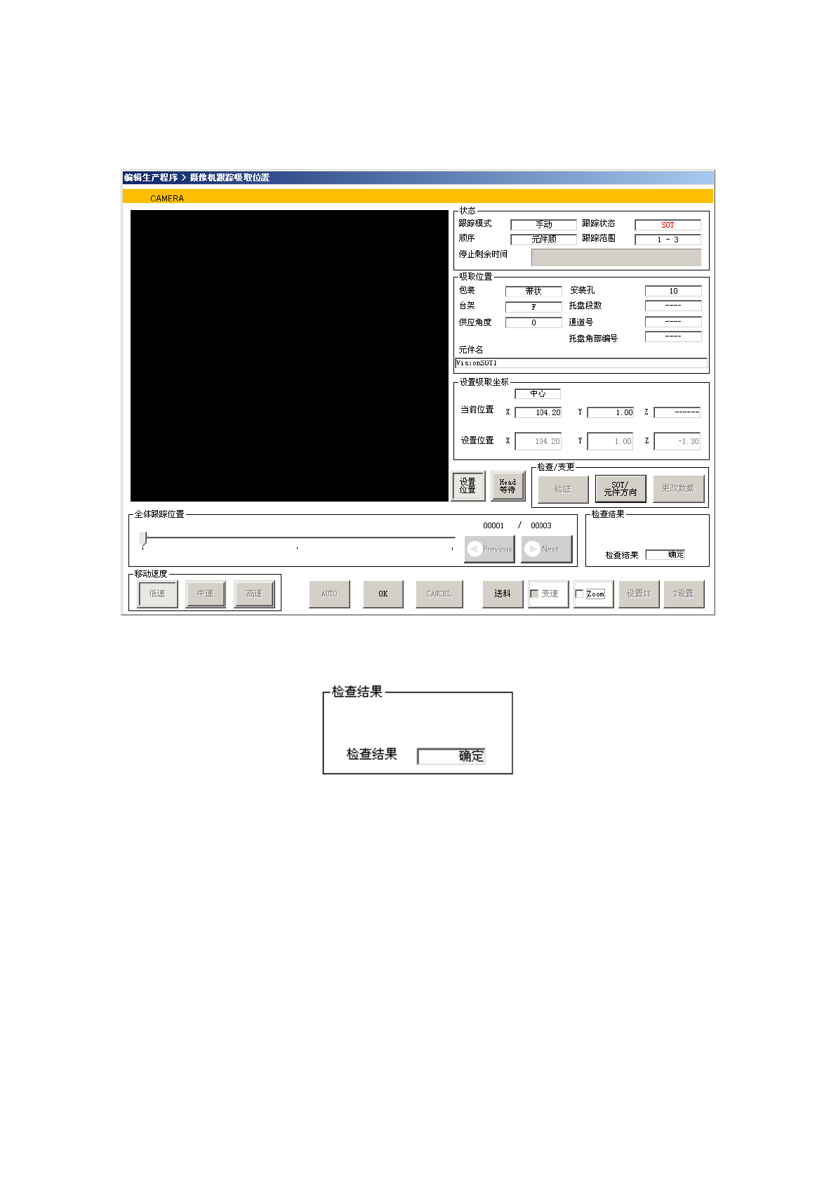 第 1 部 基本编 第 4 章 制作生产程序 (10) 跟踪时的 SOT 方向检查 ( 选购项 ) / 元件方向检查 在跟踪暂停时, 可进行 S OT 方向检查或元 件方向检查。 在 S OT 方向检查中或元件方 向检查 中,显示 如下画面 。 SOT 方向检 查后或元 件方向检 查,检查结果 显示 “ 确定 ” 或 “N G” 。 关于检查 的设置请 参见第 4 章 4-3-5-2- 6 检查 (2) S OT 方向 ( 选购项 ) …