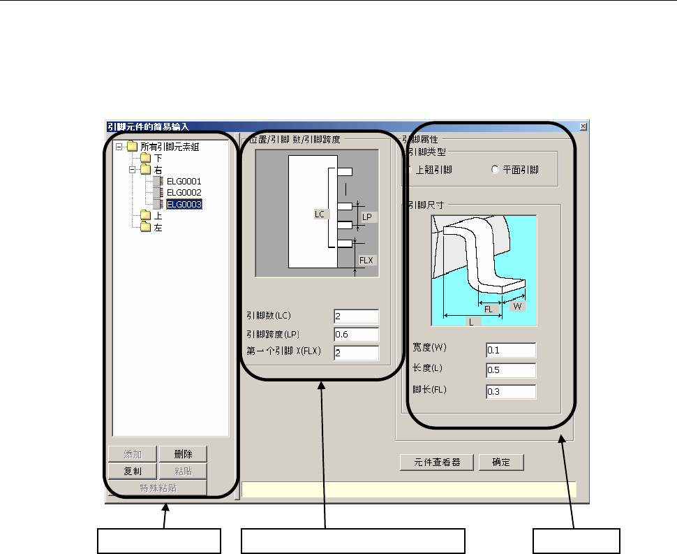 引脚元件简易输入画面由“引脚元件组一览”、“引脚位置、引脚数、引脚间距”、“引脚特征”3个项