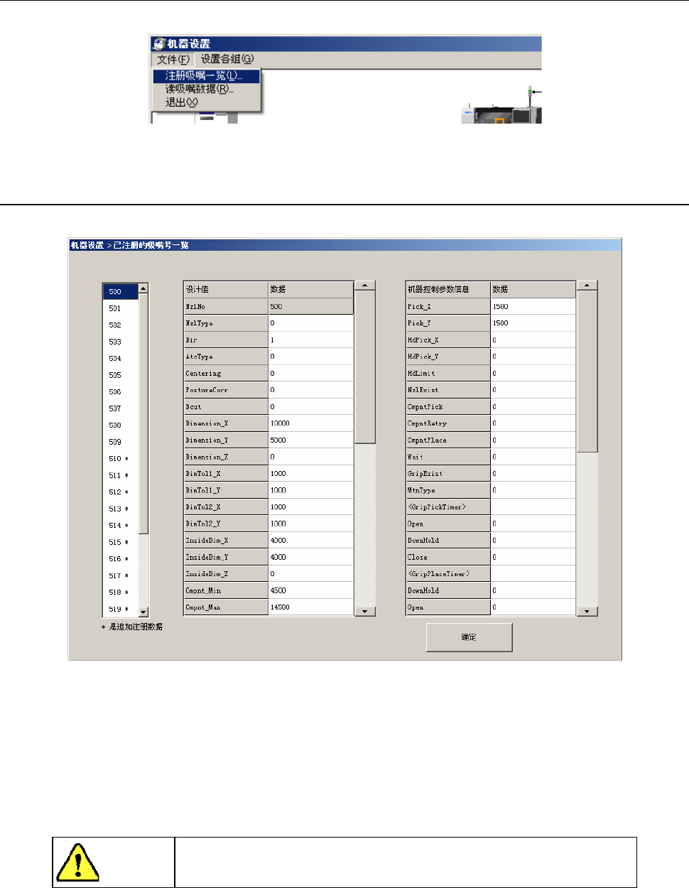 特别定制的未注册吸嘴,只显示标准吸嘴(500~509)。
