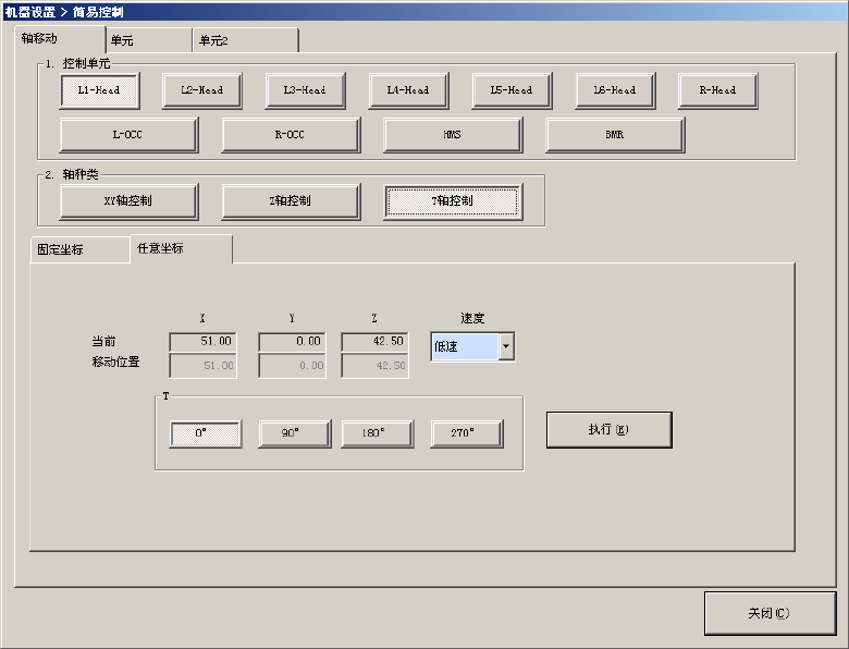 选择要控制的轴的种类“XY 轴控制”、“Z 轴控制”,按下“执行”按钮,即可把轴移至任意的指定