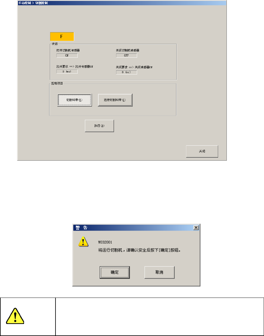 第 2 部 功能详解编 第 9 章 手动控制 9-50 (6) 切割控制 连接电动式台架后, “ 切割控制 ” 按钮变为有效。 按下 “ 切割控制 ” 按钮, 即可显示切割控制画面。 用 控制项目的单选按钮( [ 切割料带 ] 、或 [ 连续切割料带 ] )选择动作,按下 [ 执行 ] 按钮。按下 [ 执行 ] 按钮后,会显示提示,按下 [ 确定 ] 按钮后即开始运行。 状态显示切割机单元的传感状态及传感反应时间。 要停止连续切割料带动…