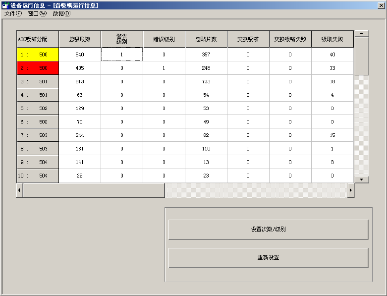 在列表中显示各吸嘴的运行次数及相关的数据。