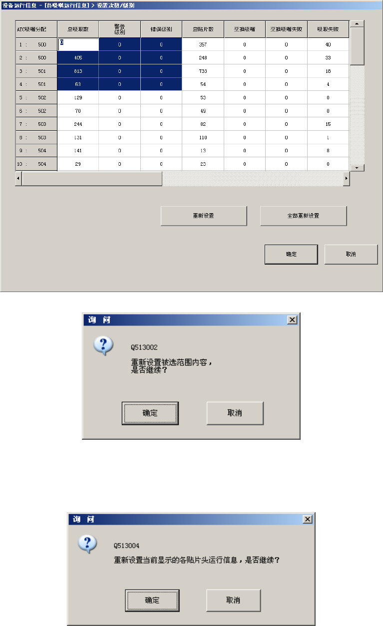第 2 部 功能详解编 第 10 章 设备运行信息 10-10 7 ) 按下 “ 全部重新设置 ” 按钮,可对所有的数据(所有的供料器台架)实施重新设置。 按下询问信息画面内的 “ 确定 ” 后,被选中的区域将被重新设置。