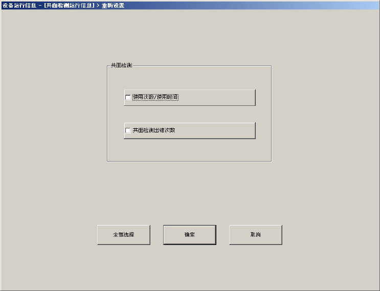 第 2 部 功能详解编 第 10 章 设备运行信息 10-31 (2) “ 重新设置 ” 按钮 点击 “ 重新设置 ” 按钮,或点击下拉菜单中的 “ 数据 (D)”-“ 重新设置 ” 后,显示如下画面。 可清除一览中的特定内容或所有内容。 ・ 按 “ 全部选择 ” 按钮,可选择所有的复选框。 ・ 点击需要重新设置的项目复选框, 按 “ 确定 ” 按钮后, 可显示 “ 询问信息 ” 画面, 点击 “ 确定 ” 后, 对象项目都将被重新设置…