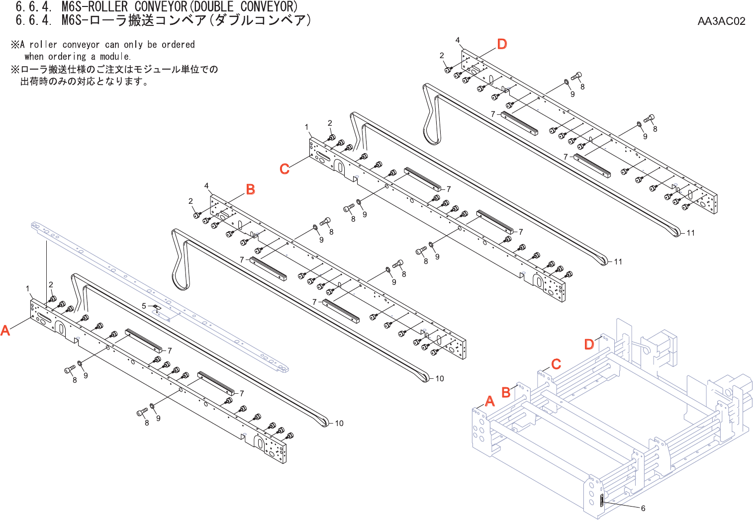6.6.4. M6S-ROLLER CONVEYOR(DOUBLE CONVEYOR) 6.6.4. M6S-ローラ搬送コンベア(ダブルコンベア) AA3AC02 No. Drg.No. & Code No. QTY Description Rating Materials Remarks 番号 図番 & コード番号 個数 品名 規格 材質 備考 1 PM024A1 2 PLATE プレート FE 2 XR00320 …
