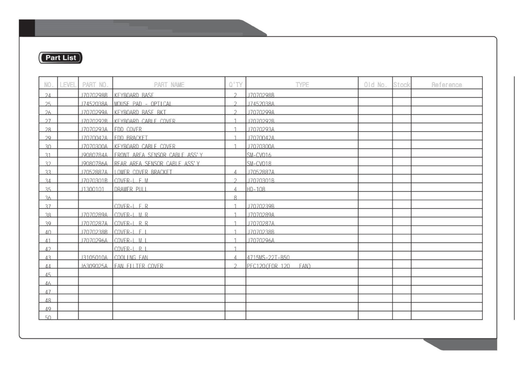 NO. LEVEL PART NO. PART NAME Q'TY TYPE Old No. Stock Reference