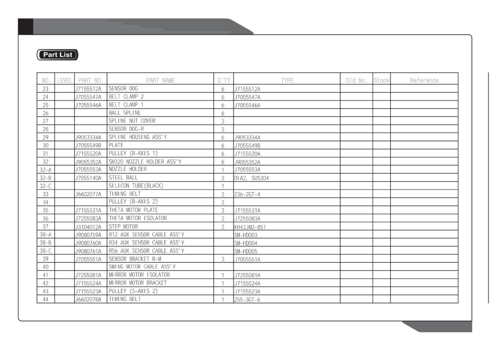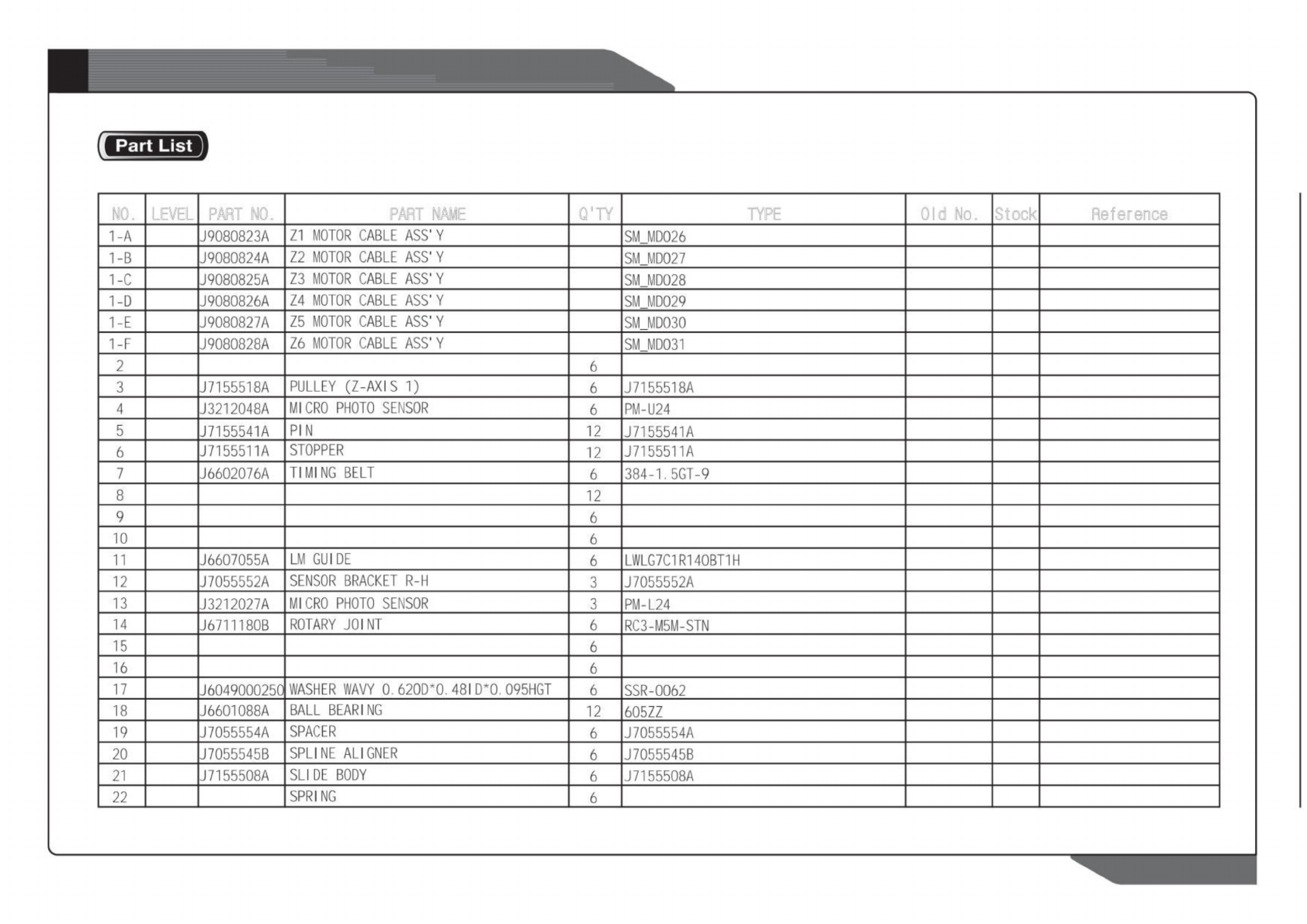 NO. LEVEL PART NO. PART NAME Q'TY TYPE Old No. Stock Reference
