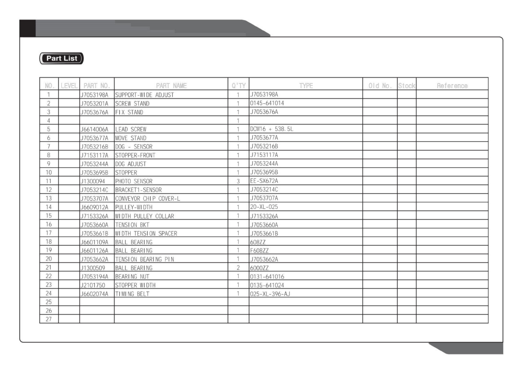 J66071001A J66070 25A LM GUIDE SBG20-SL-1-K1-460-N-2 E ntryCo n v eyorAss'y 67 Pag e SAM SUNGTECHWIN NO. LEVEL PART NO. PART NAME Q'TY TYPE Old No. Stock Reference Lisf) NO. LEVEL PART NO. PART NAME Q&apos…