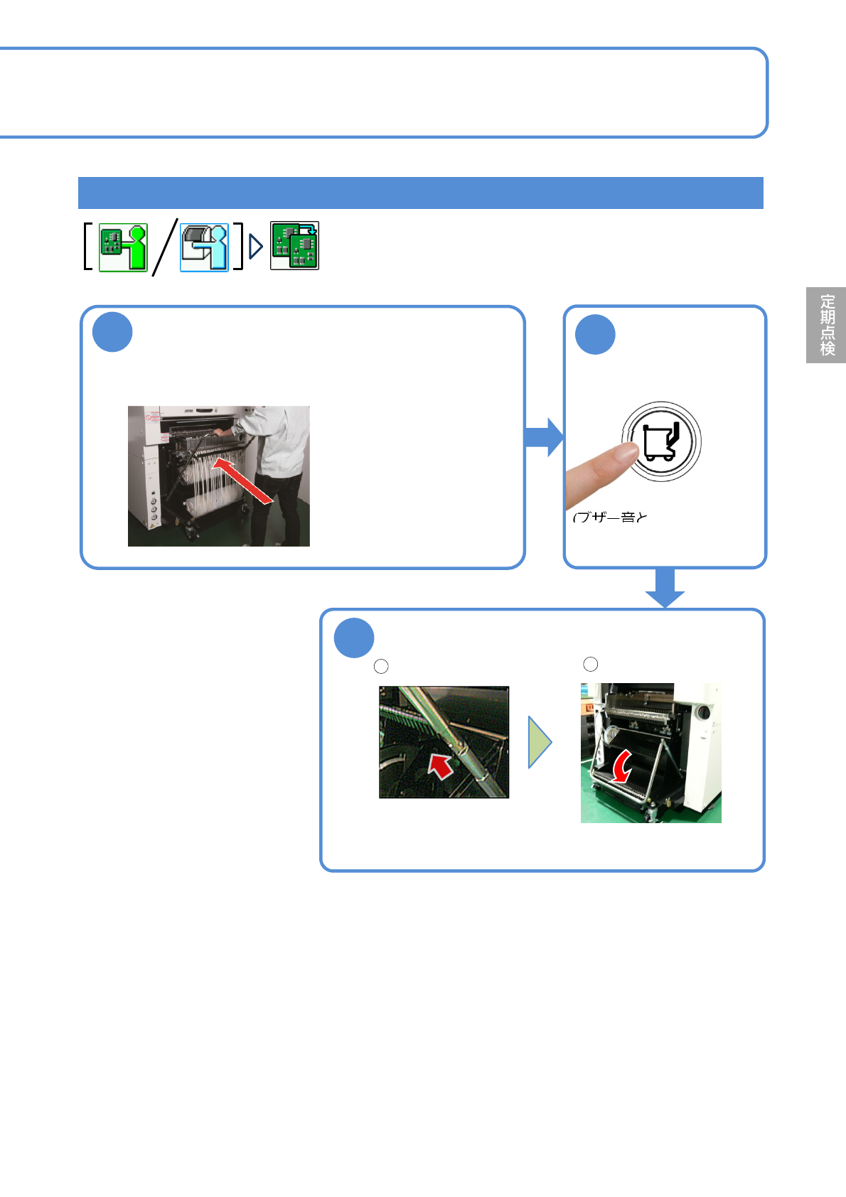 NPM-W 2 EJM7DJ-MB-03M-00 1 3-2 -1 2 3 秒以上押す ( ブザー音と共に本体設備からの取外 しが可能となり、ランプが点灯から 点滅に変わる ) ハンドルを固定す る 取り外し方法 3 交換台車を 引き出す 1 ハンドルを持ち上げる ※ 交換台車が約 100 mm 手前に移動 するため注意してください。 2 パイプを止まるまで 下げる ※ ハンドルを持ち上げるとき フィーダー用電源ケーブル を挟まないよう…